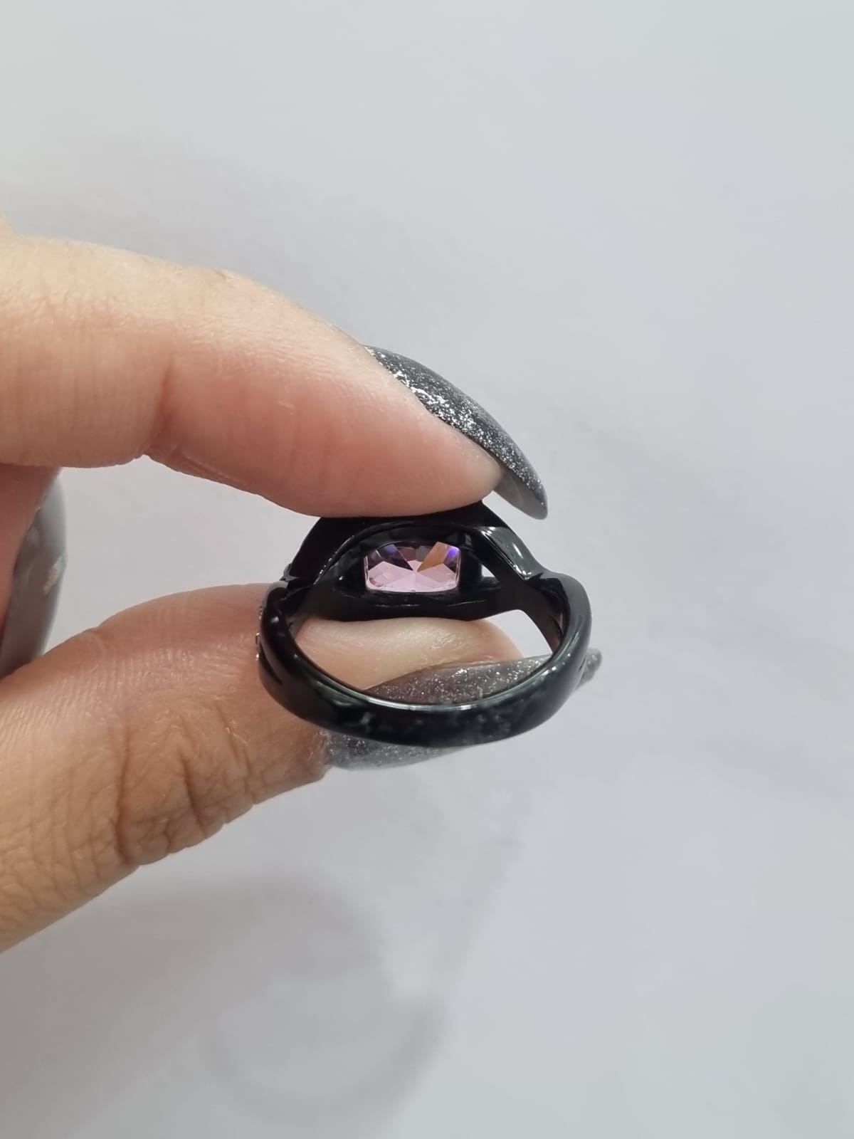 Modelo: Anillo de acero bañado en color negro con detalle de strass pegados color rosa y blanco.