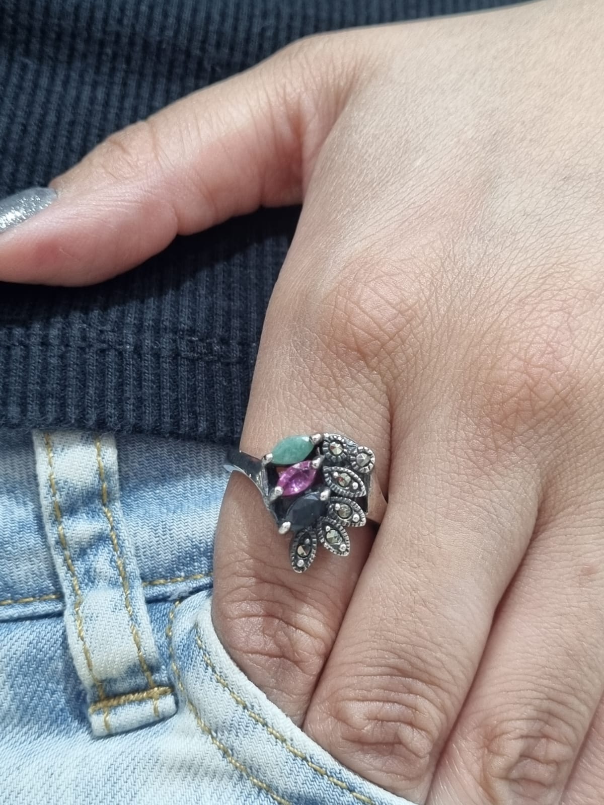 Descripcion: Anillo de plata linea hindu con piedra natural raiz de zafiro, rubi y esmeralda engarzadas y detalles marquesitas pegadas.
