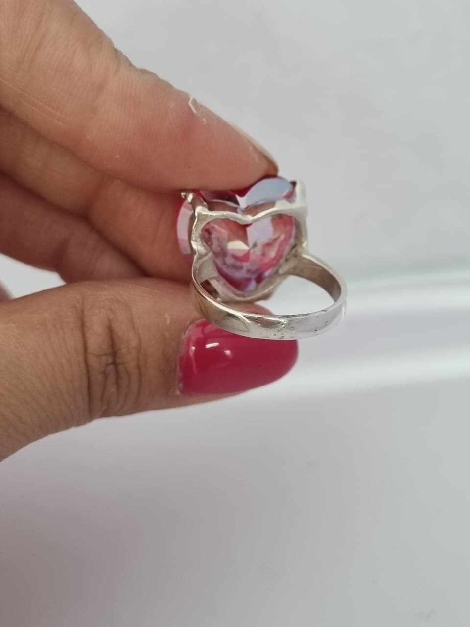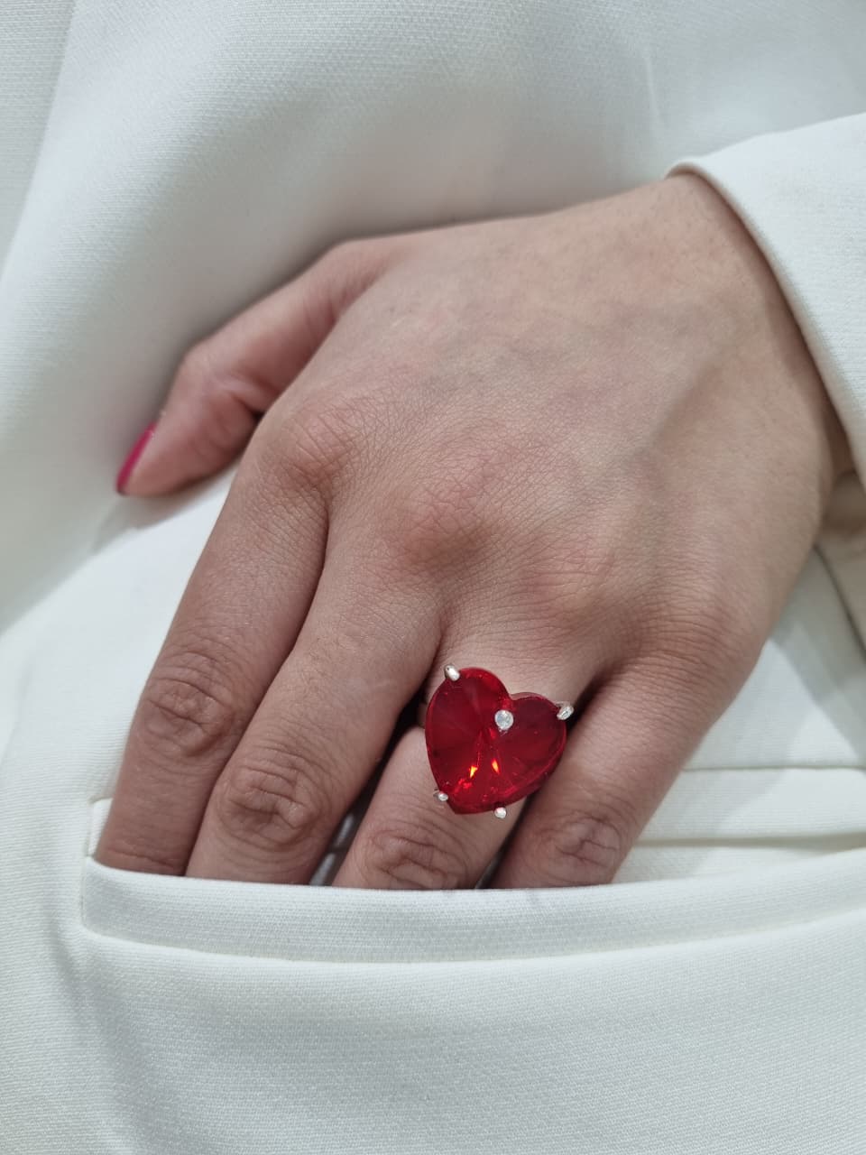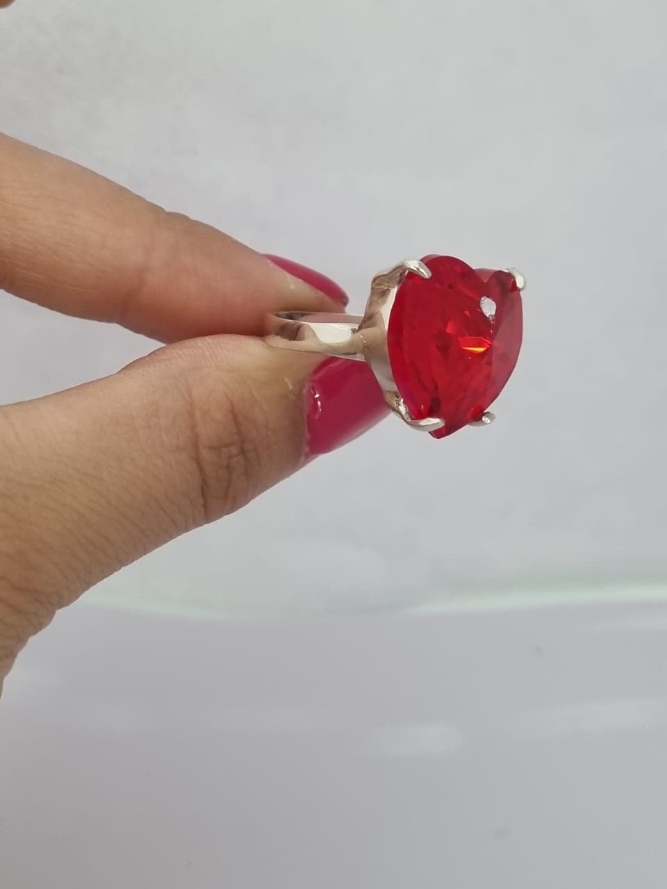 Descripción: Anillo de plata modelo con piedra diseño corazón de cristal europeo el cual esta engarzado de color rojo y detalle de strass color blanco el cual esta pegado.