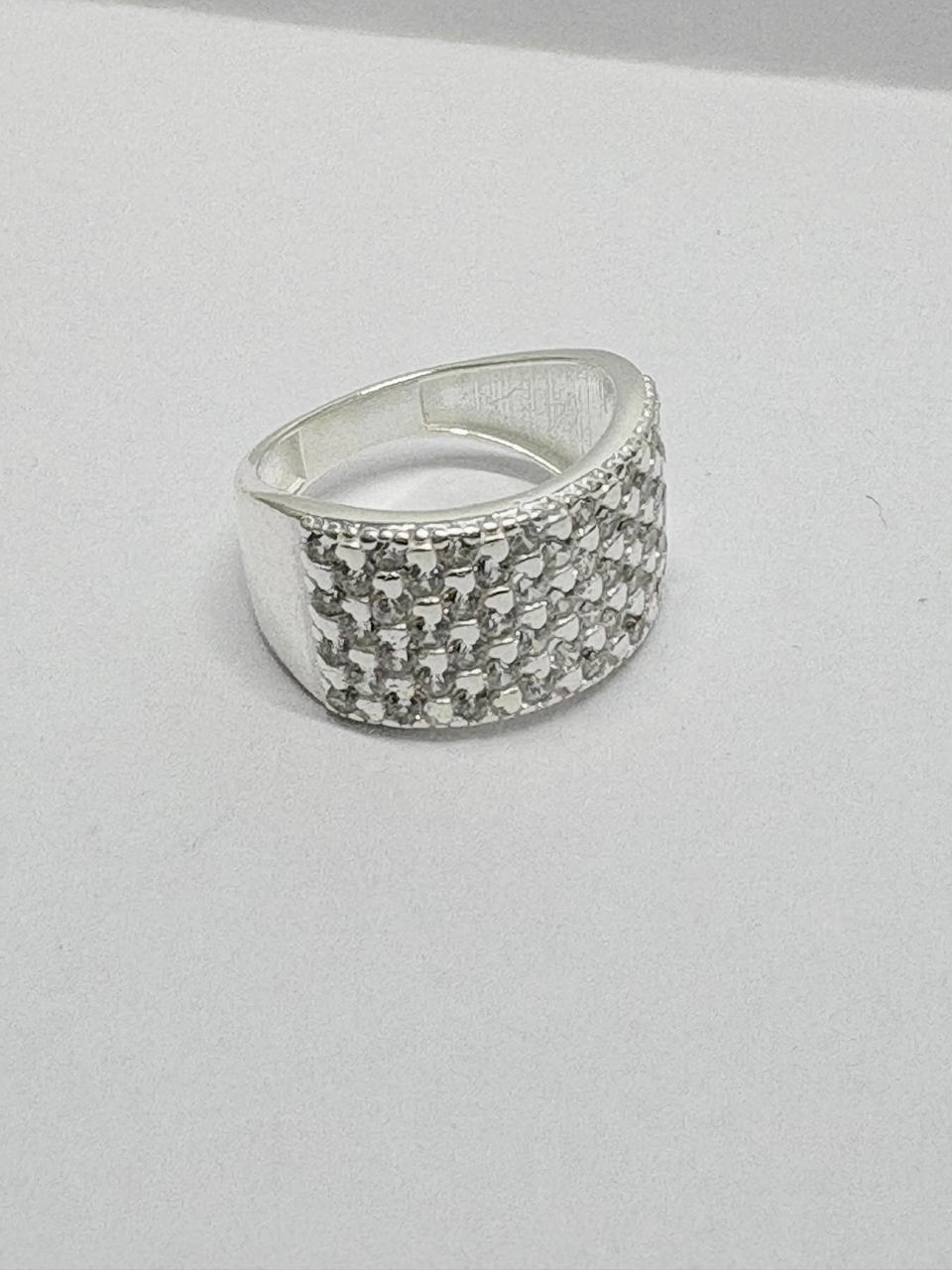 Descripcion: Anillo de plata modelo ancho con piedras llamadas cubics las cuales estan engarzadas.