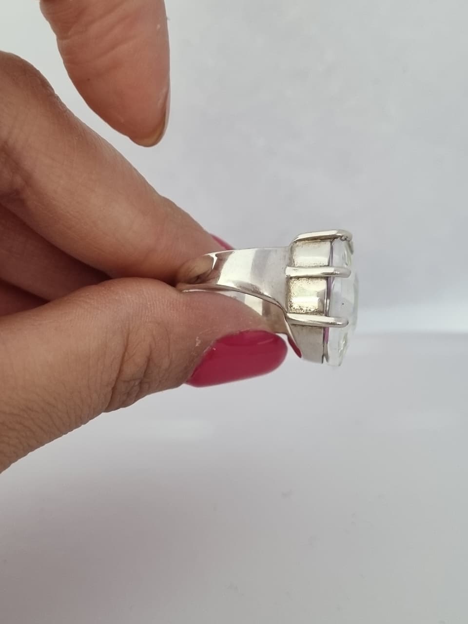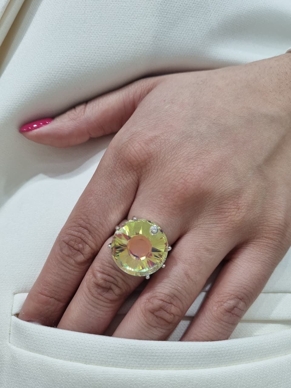 Descripción: Anillo de plata modelo con piedra diseño circulo de cristal europeo el cual esta engarzado color aurora boreal y detalle de strass color blanco el cual esta pegado.