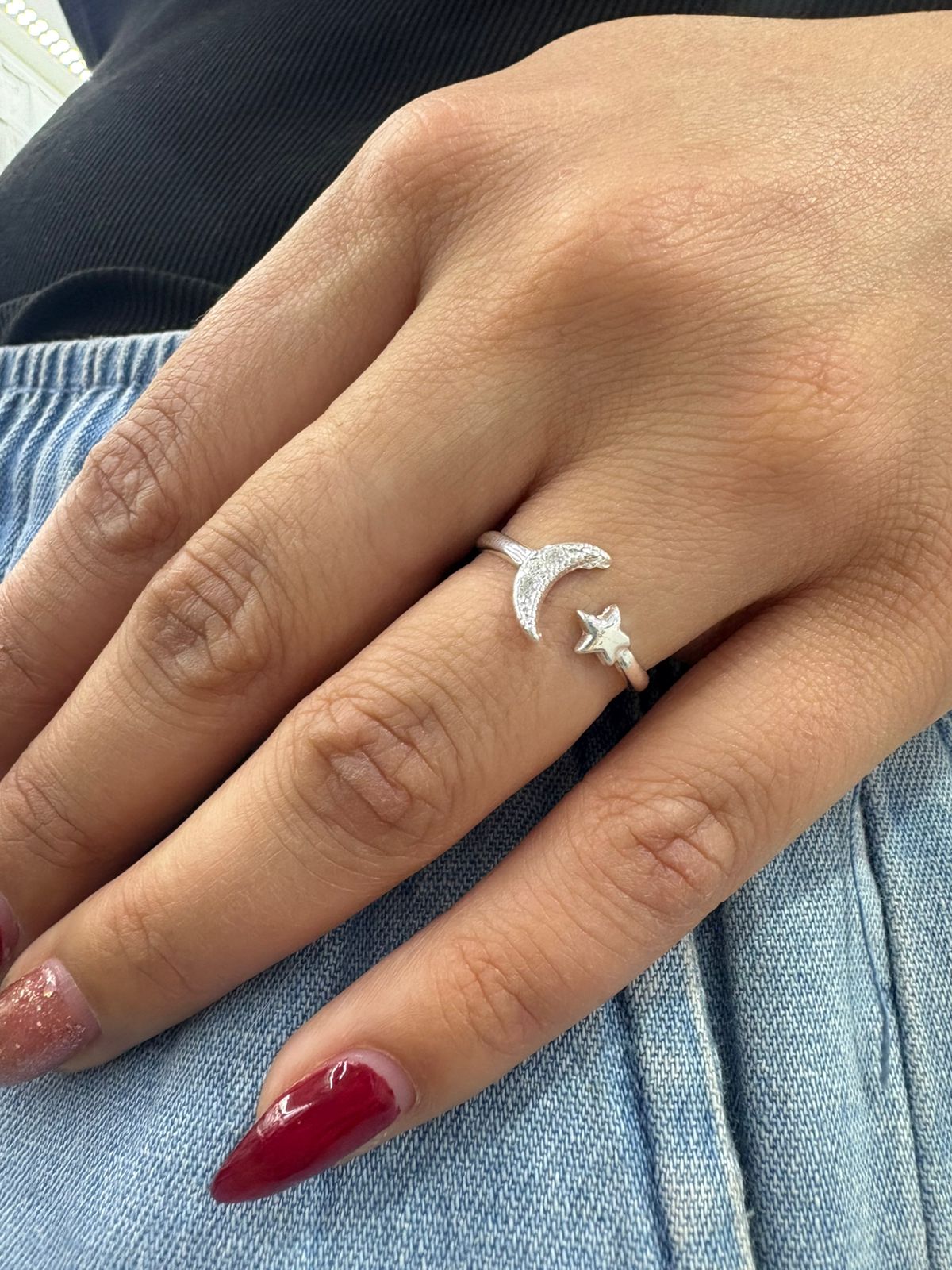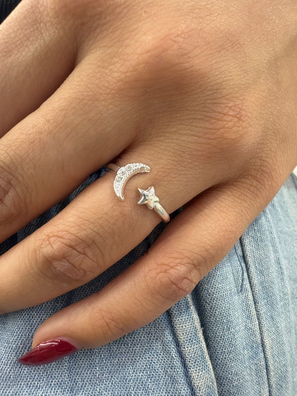 Descripción: Anillo de plata modelo estrella y luna con piedras llamadas cubics la cual esta engarzada.