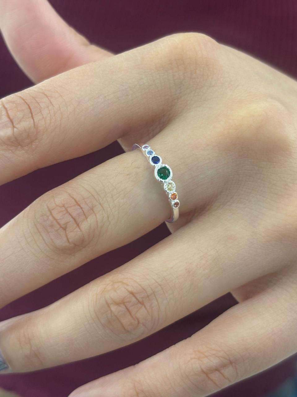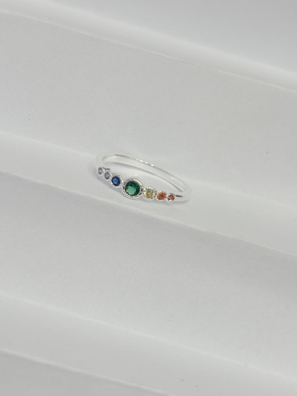 Descripción: Anillo de plata rodinada italiana modelo 7 chacras con detalles de piedra llamada cubics la cual esta engarzada.