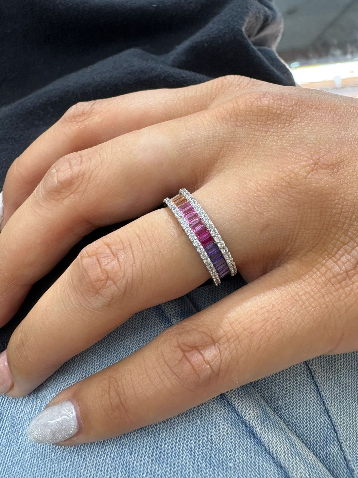 Descripción: Importante anillo de plata rodinada italiana modelo medio sin fin con piedras llamadas cubics en variedad de colores las cuales estan engarzadas.