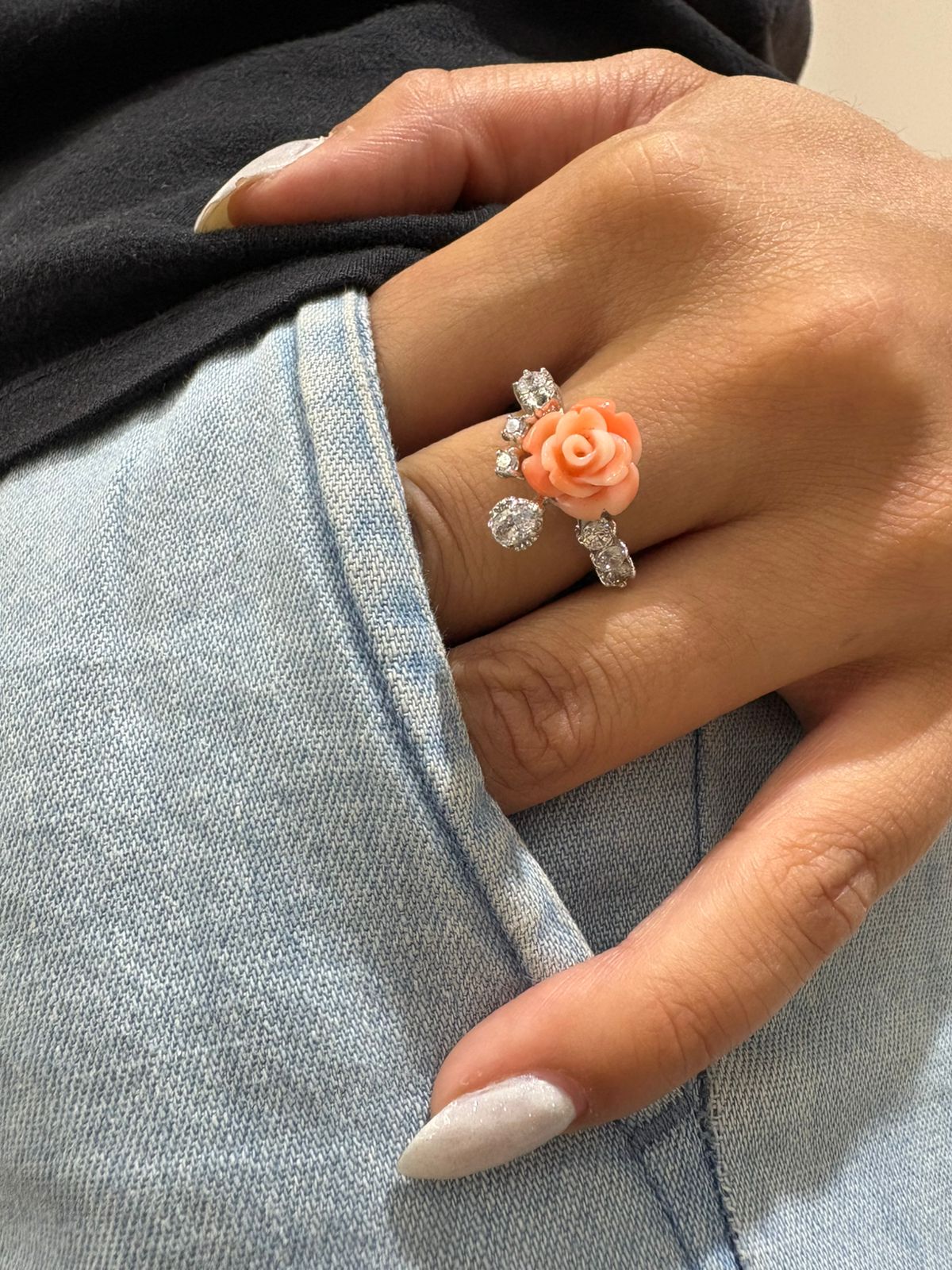 Descripción: Anillo de plata rodinada italiana con piedras llamadas cubics los cuales estan engarzados y resina diseño flor pegada.