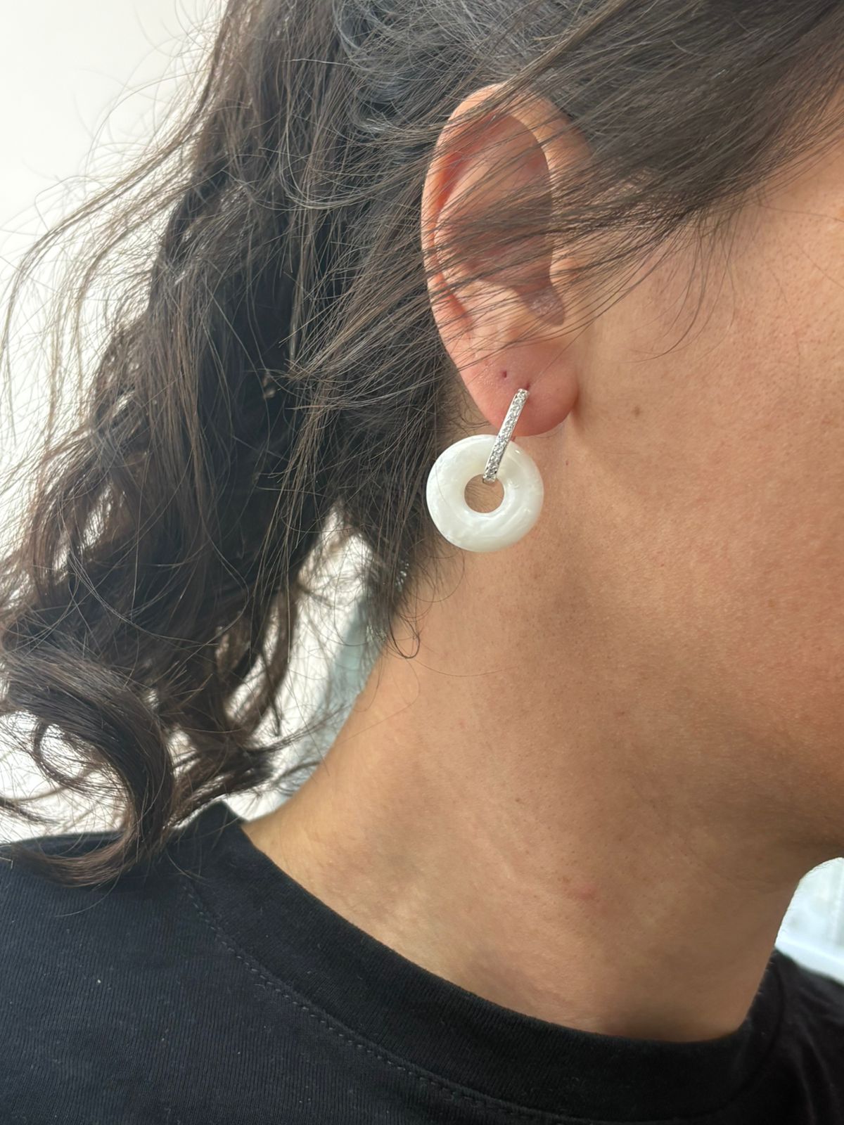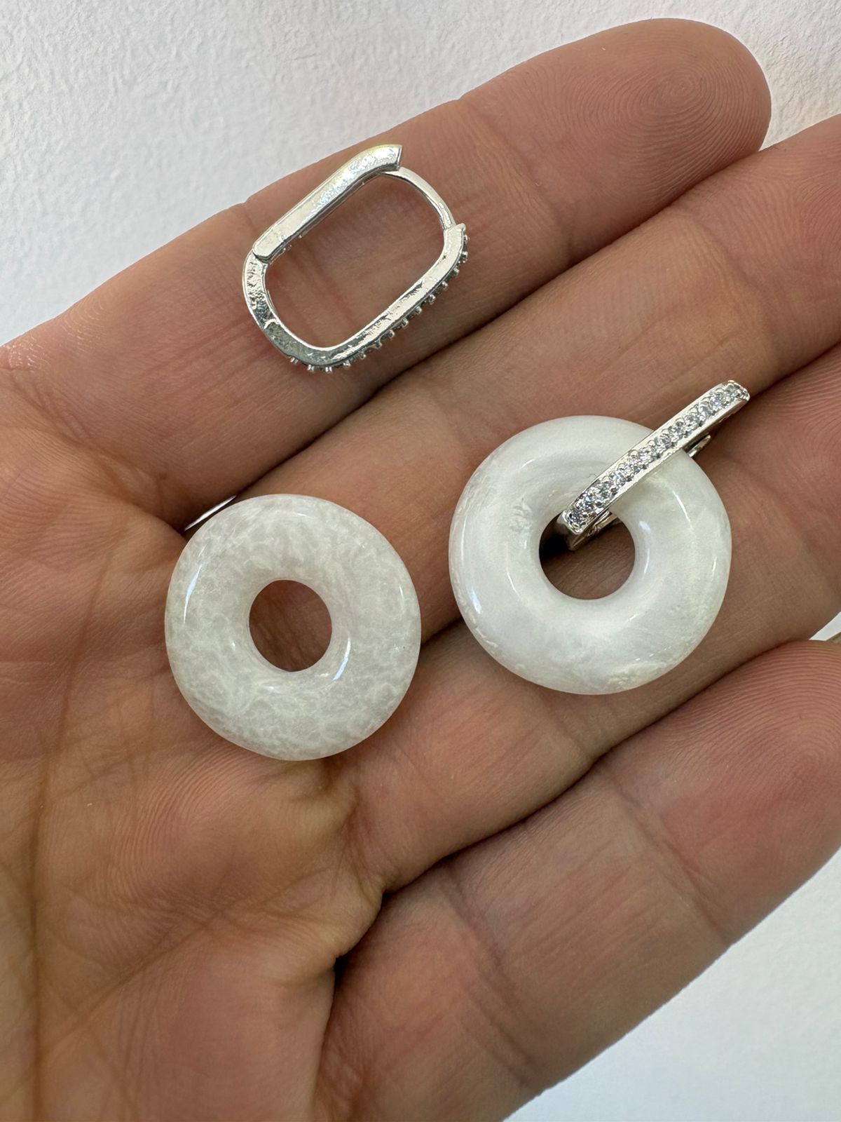 Modelo: Aros huggies rectangulres con strass y dije circulo pasante de acrilico. El diseño permite poder sacar los circulos pudiendo de esa forma ser utilizados de dos formas distintas.