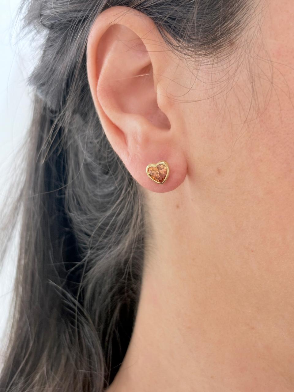 Descripción: Aros de plata con oro modelo corazón de 7mm con piedra cubics color ambar (engarzada).