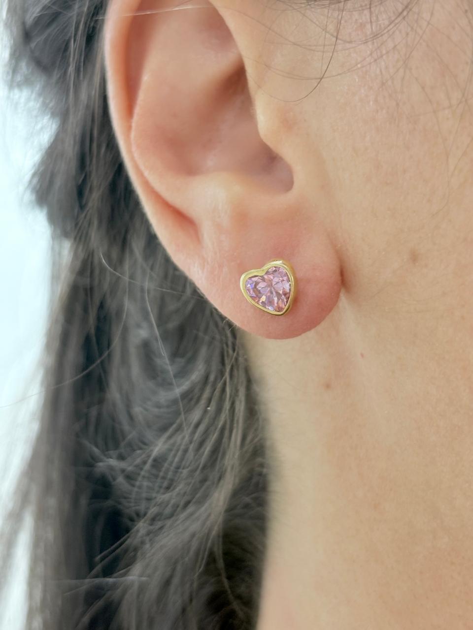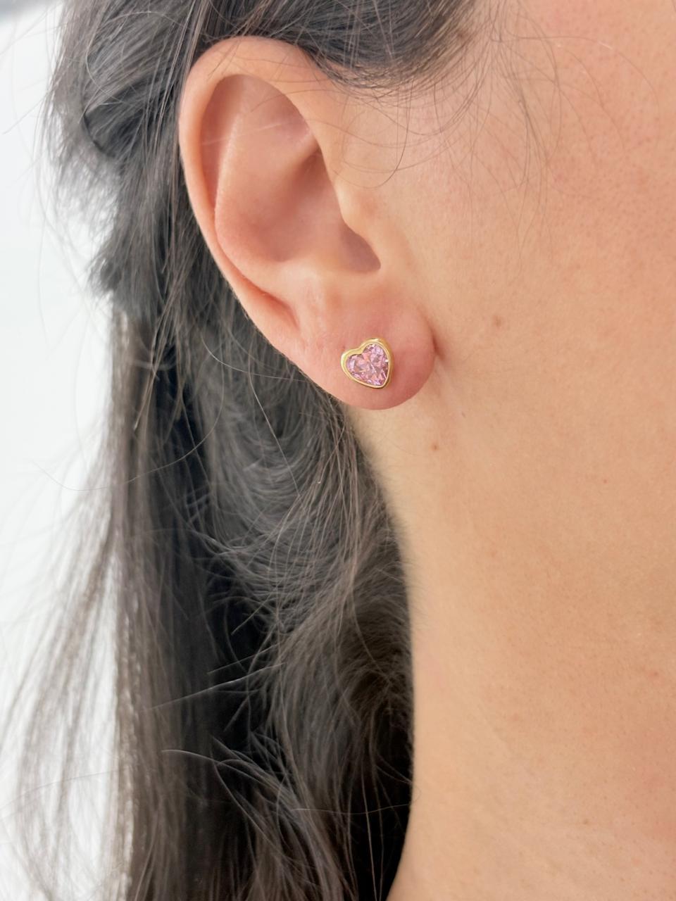 Descripción: Aros de plata con oro modelo corazón de 7mm con piedra cubics color rosa (engarzada).