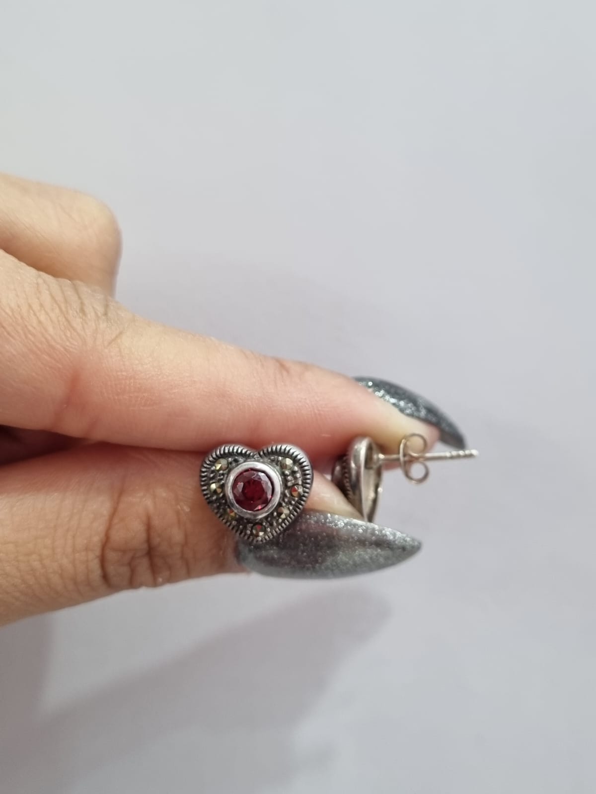 Descripción: Aros de plata 925 con sistema pasante con cierre mariposa. Diseño corazón el cual tiene detalles de marquesitas color gris (pegadas) y centro de piedra cubics color rojo (engarzada).