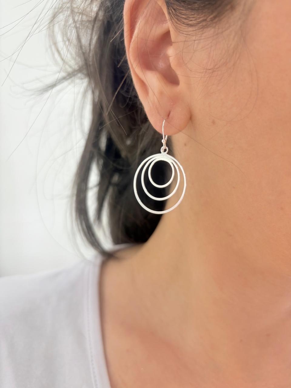 Descripción: Aros de plata 925 con sistema pasante y colgante . El diseño tiene circulos de diferentes tamaños.