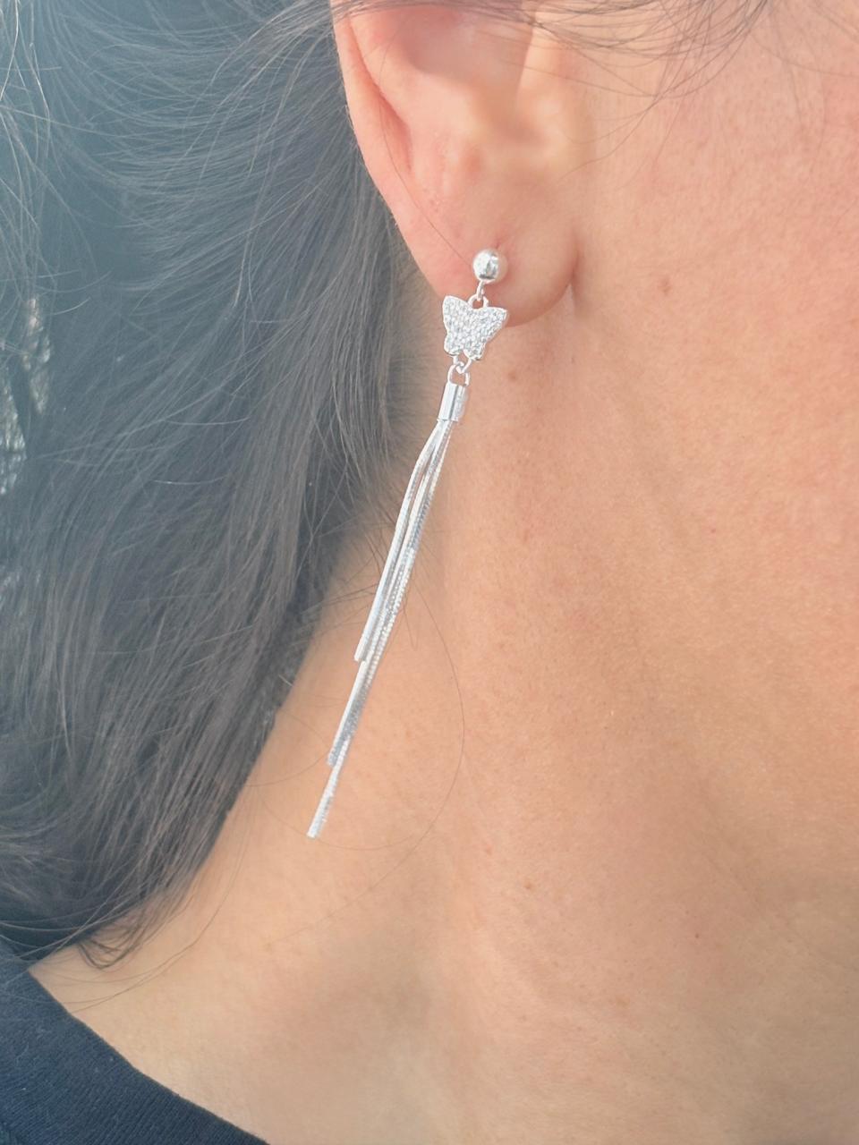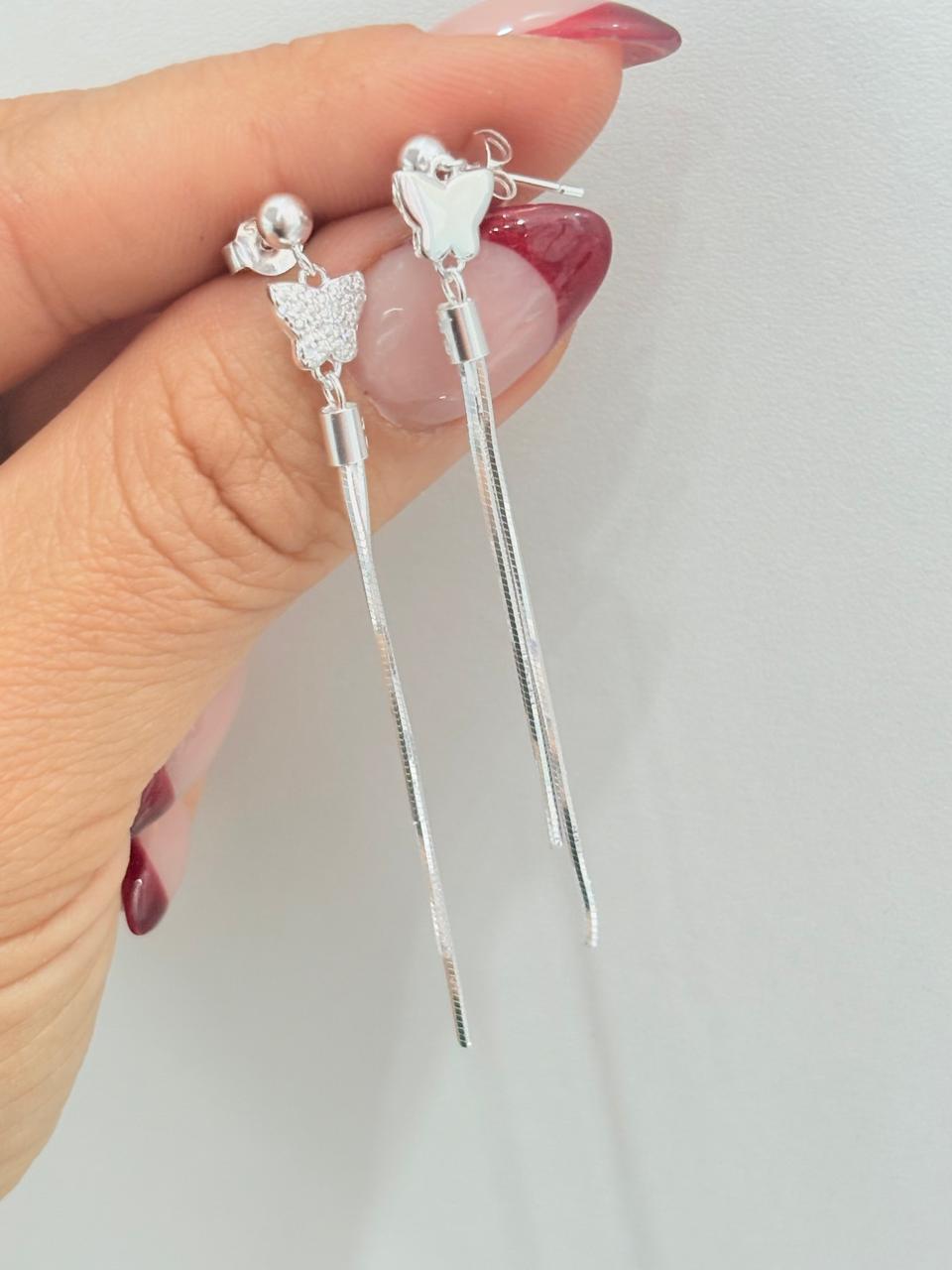 Descripción: Aros de plata 925 con sistema pasante ,colgante con cierre mariposa. El diseño tiene una esfera lisa con una mariposa la cual tiene piedras llamadas cubics (engarzados) y cadenas tramado clapton (semi figido) colgantes.