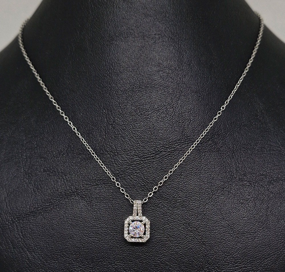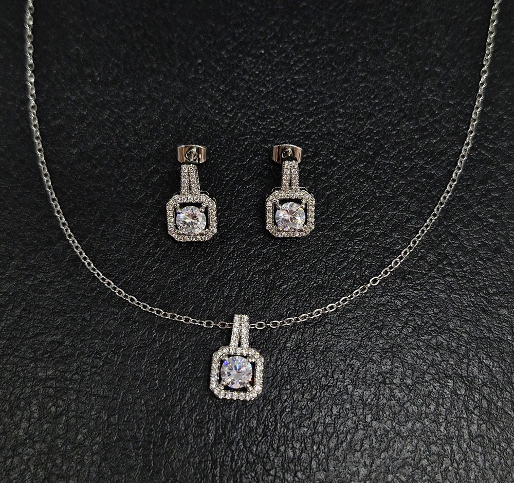 Linea: Cadena con dije y aros diseño cuadrado con detalles de strass pegados.