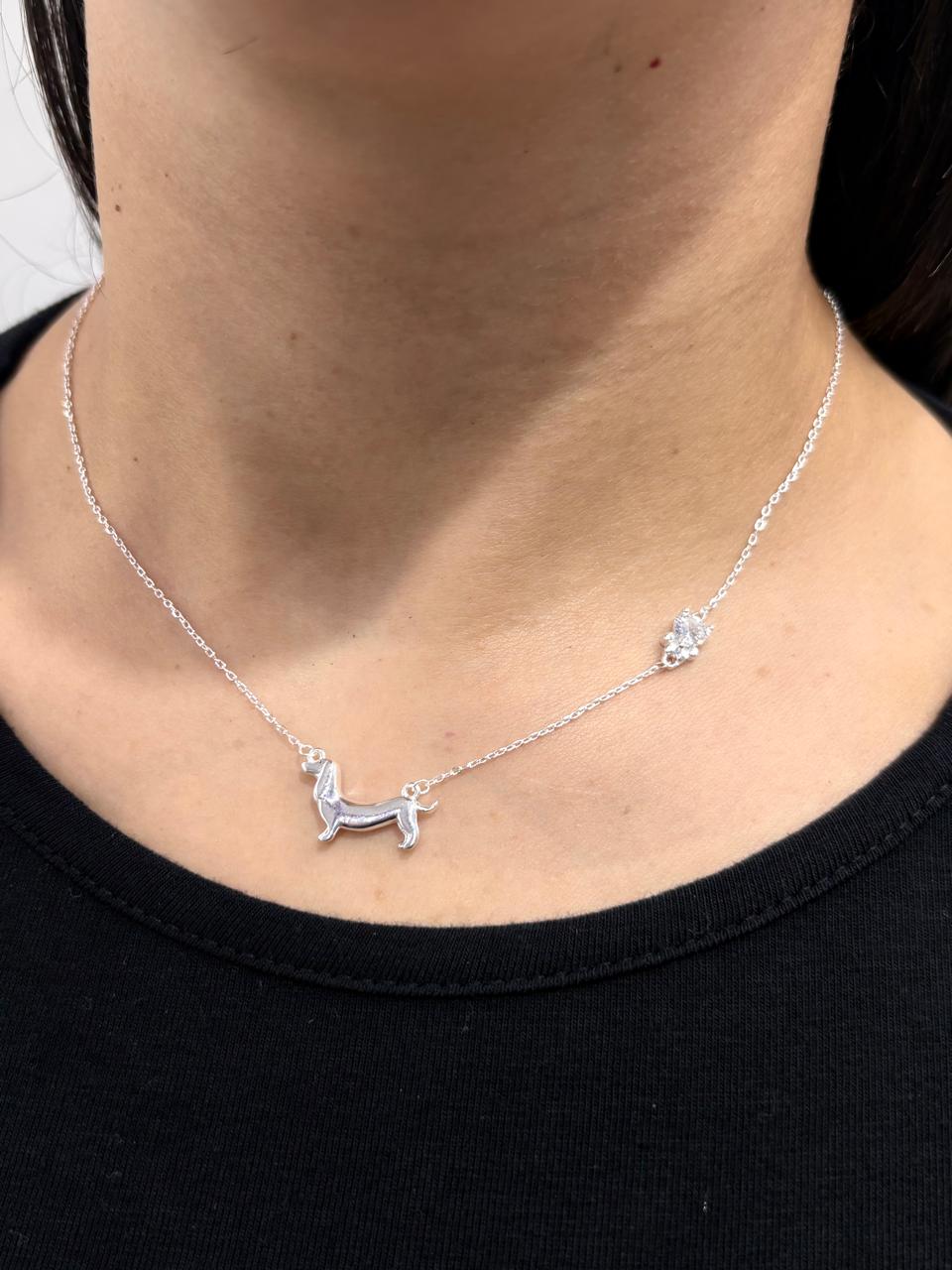 Modelo: Conjunto de cadena con dije perro salchica de plata lisa y dije corazón con piedra.