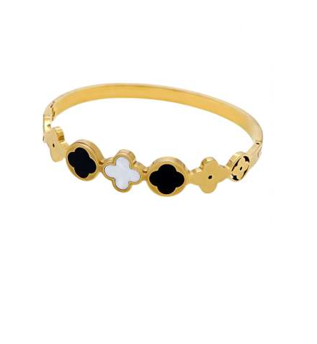 Descripción: Pulsera de acero bañado en dorado diseño esclava con treboles y acrilicos pegados.