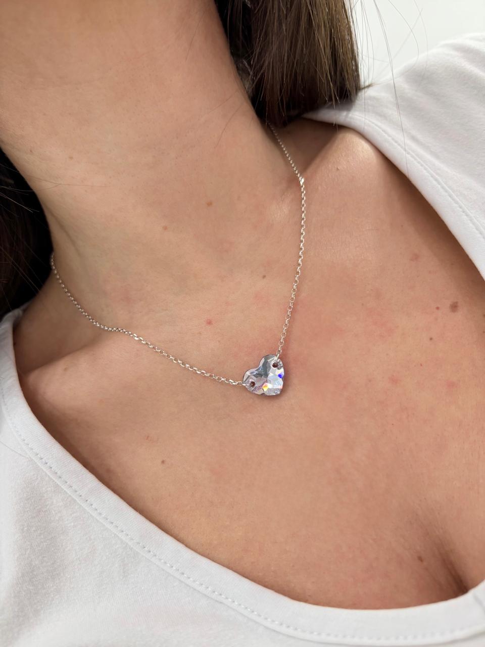 Descripcion: Conjunto de plata 925 con CORAZÓN de cristal europeo color plateado tornasolado el cual tiene perforaciones donde une una arrgollita a la cadena.