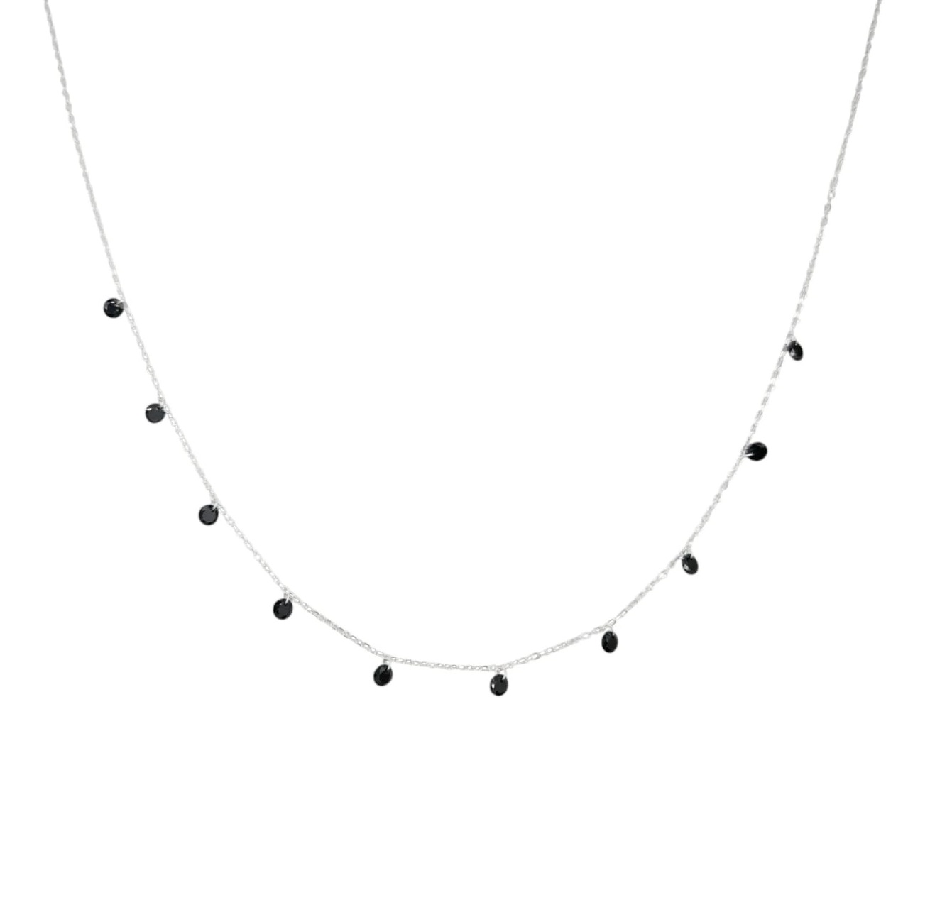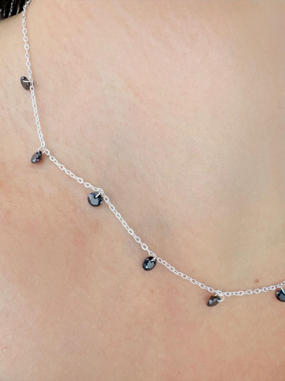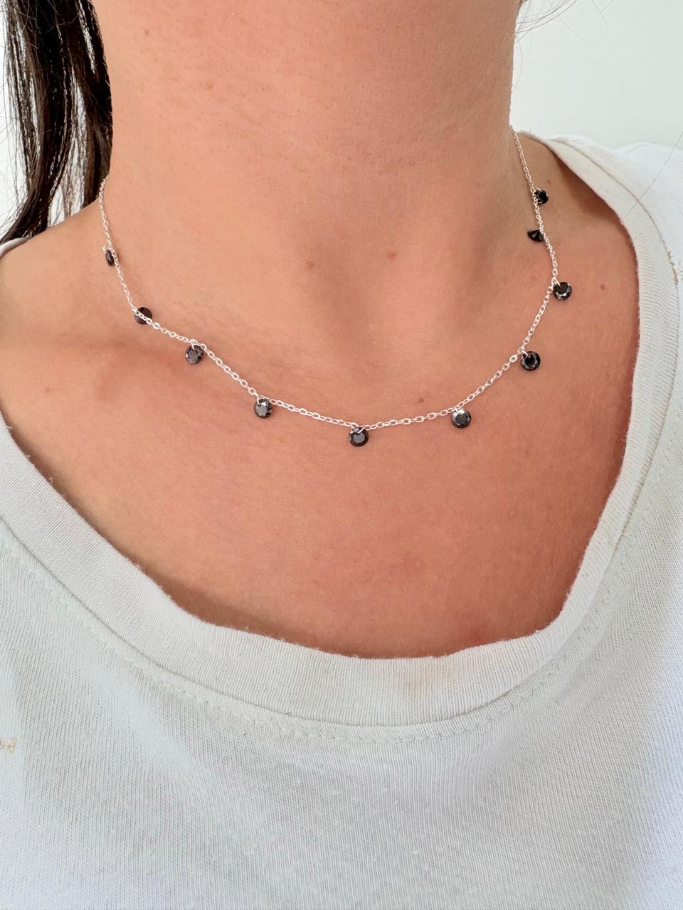 Modelo: Gargantilla de plata rodianda con cubics color negro colgantes.