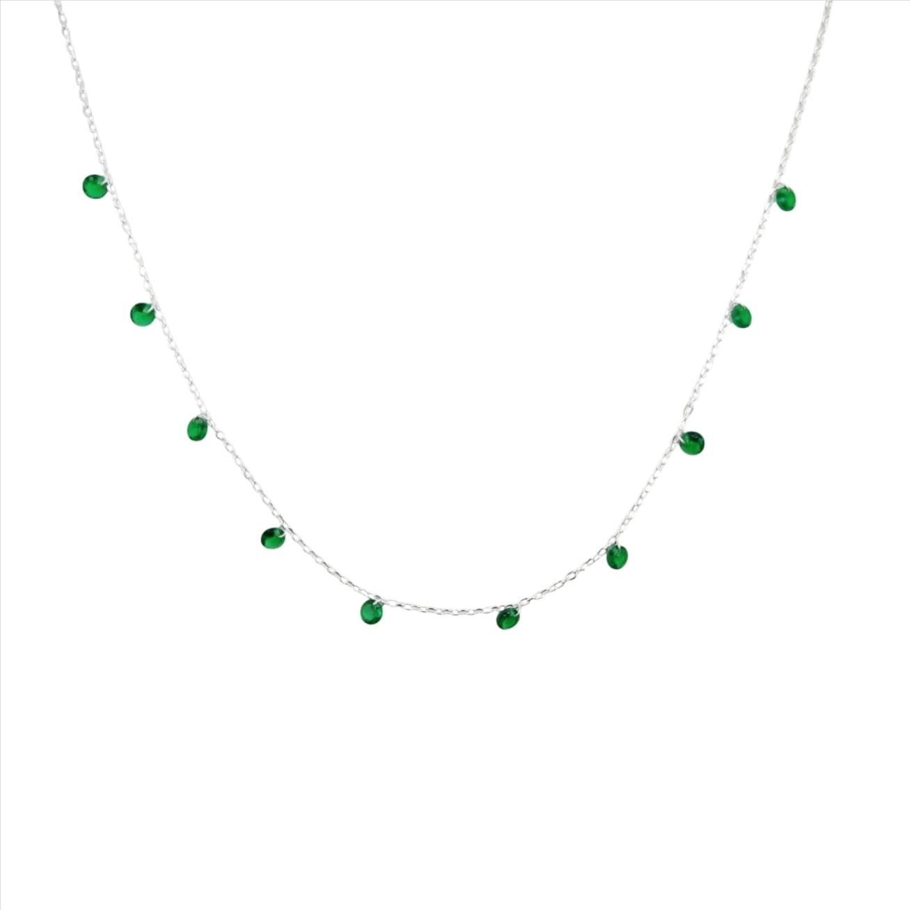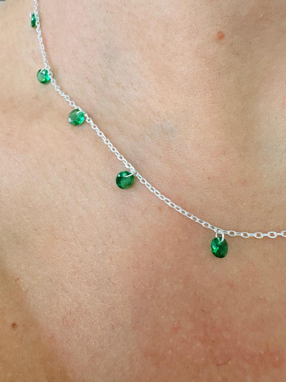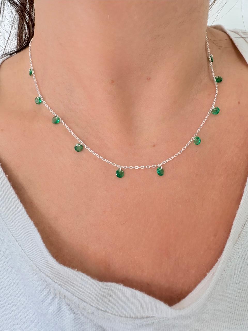Modelo: Gargantilla de plata rodianda con cubics color verde colgantes.