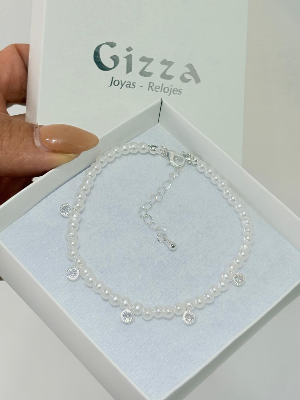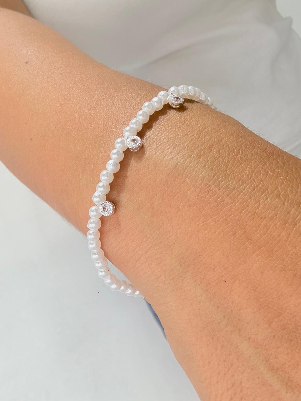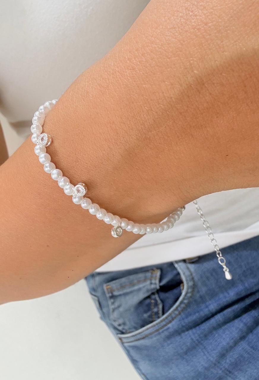 Modelo: Pulsera con simil perlas y dijes diseño circulos de acero blanco, colgantes y con strass pegados.