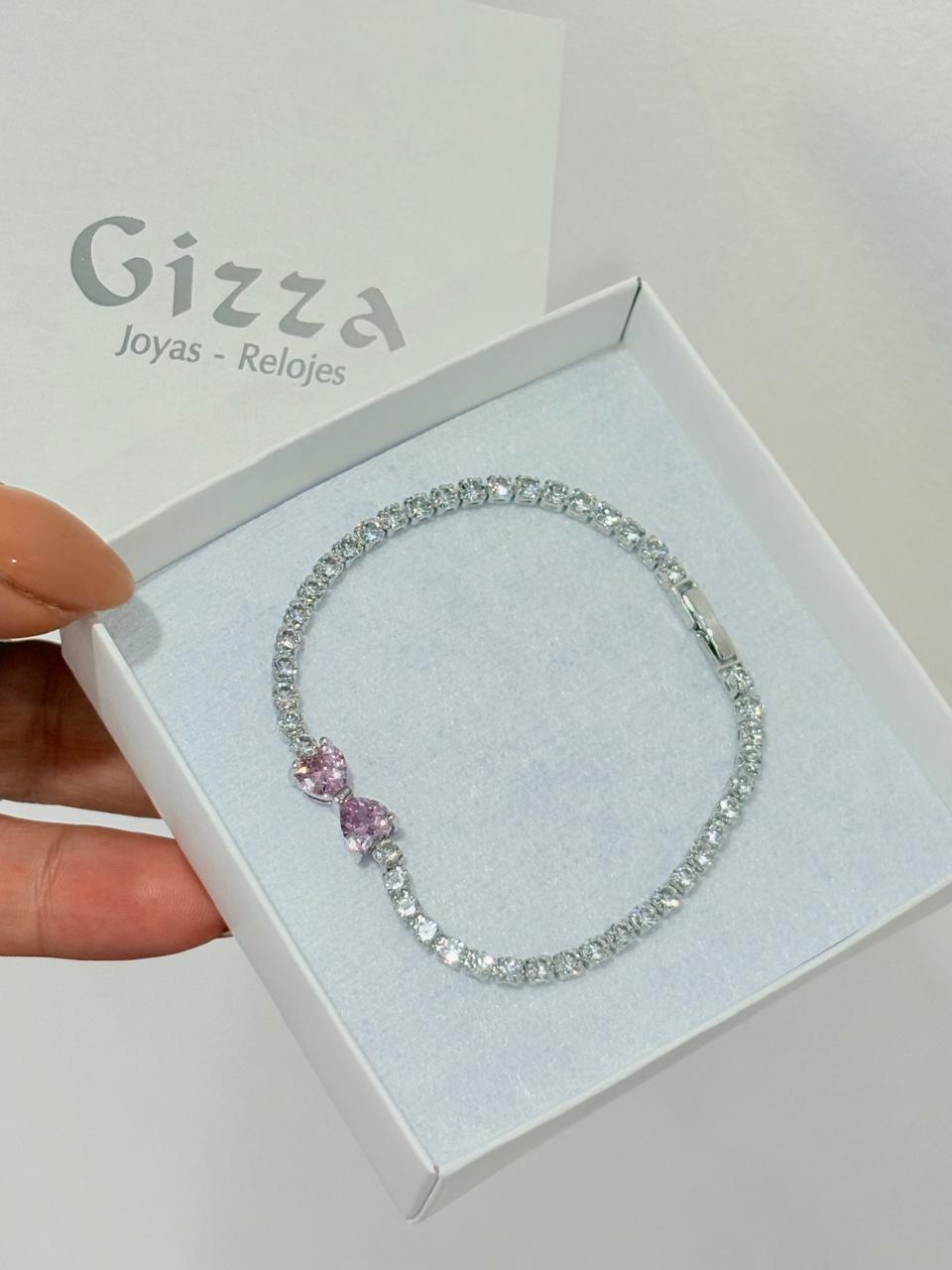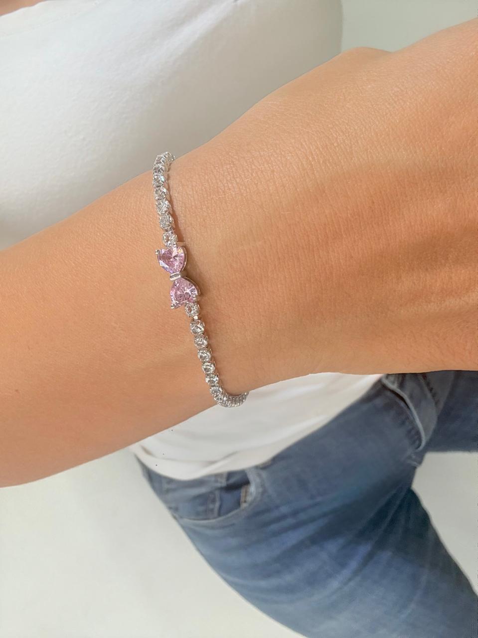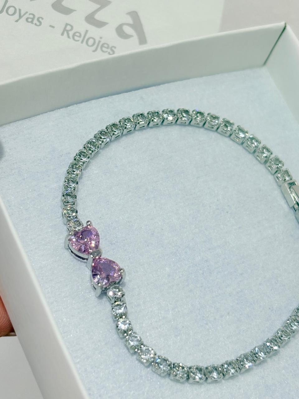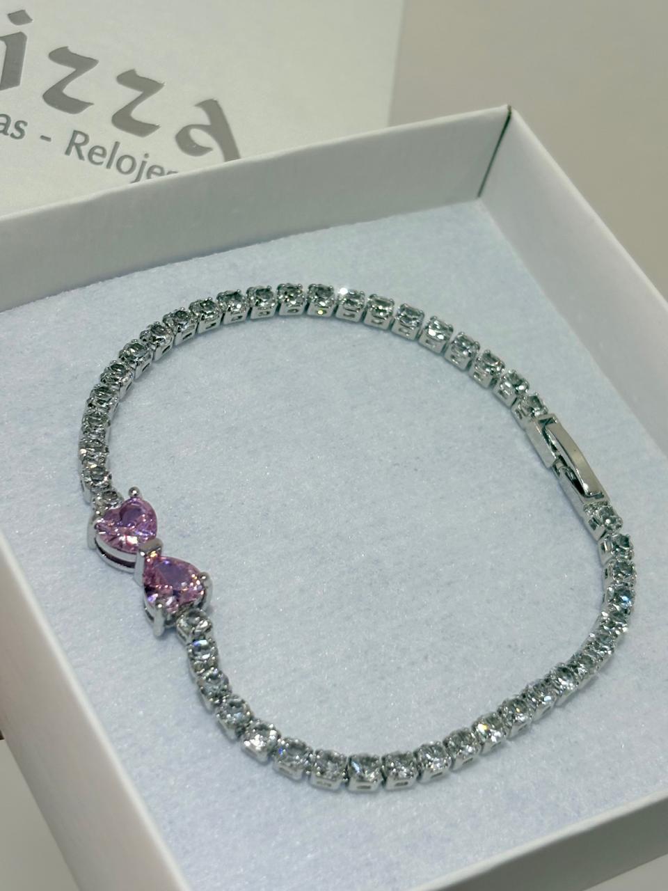 Modelo: Pulsera diseño ancho con detalle de corazones color rosa de strass.