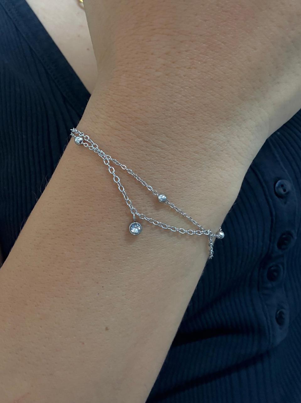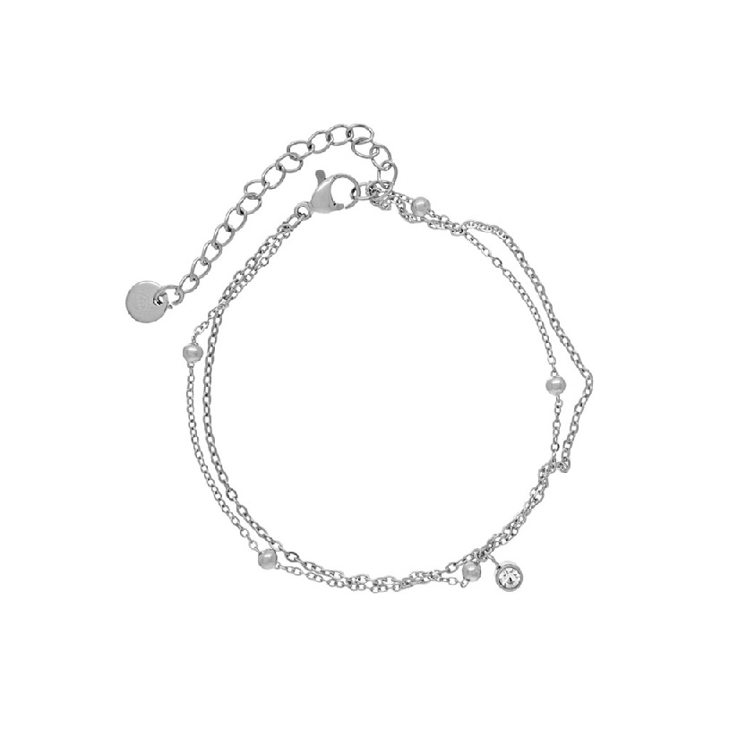 Descripción: Pulsera modelo de acero doble cadena con detalle de esferas y dije colgante con strass pegado.