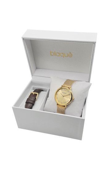 Descripción: Set de reloj analogico con malla de metal bañada en dorado y opción para intercambiar de malla de cuerina