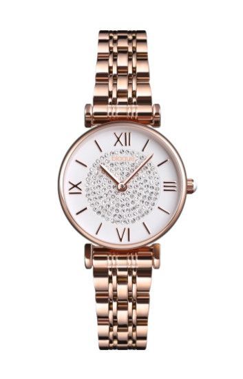 Descripción: Reloj analogico de metal bañado en color rose, fondo blanco con strass pegados por dentro.