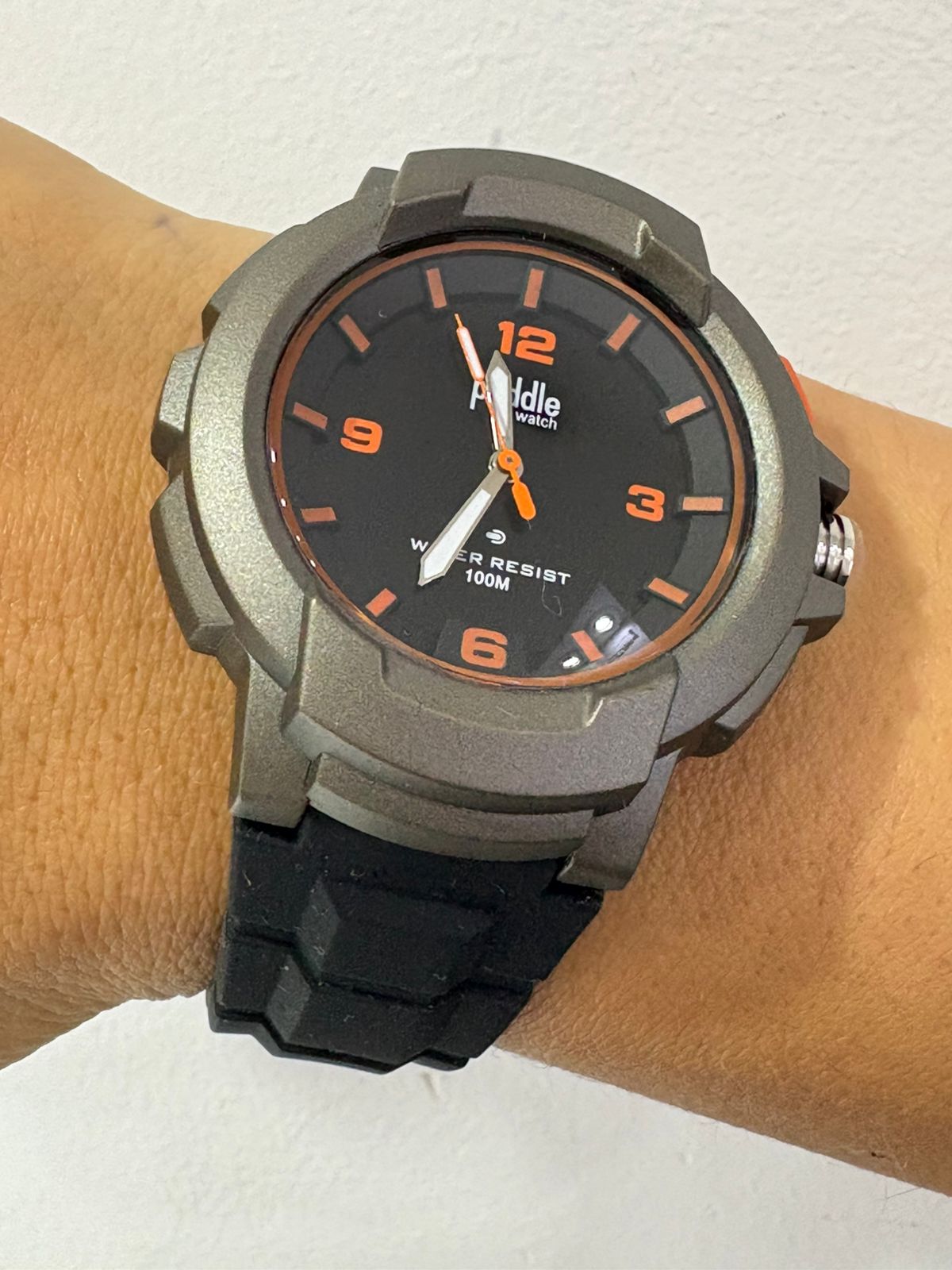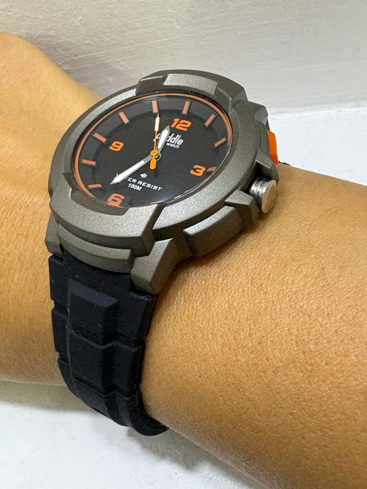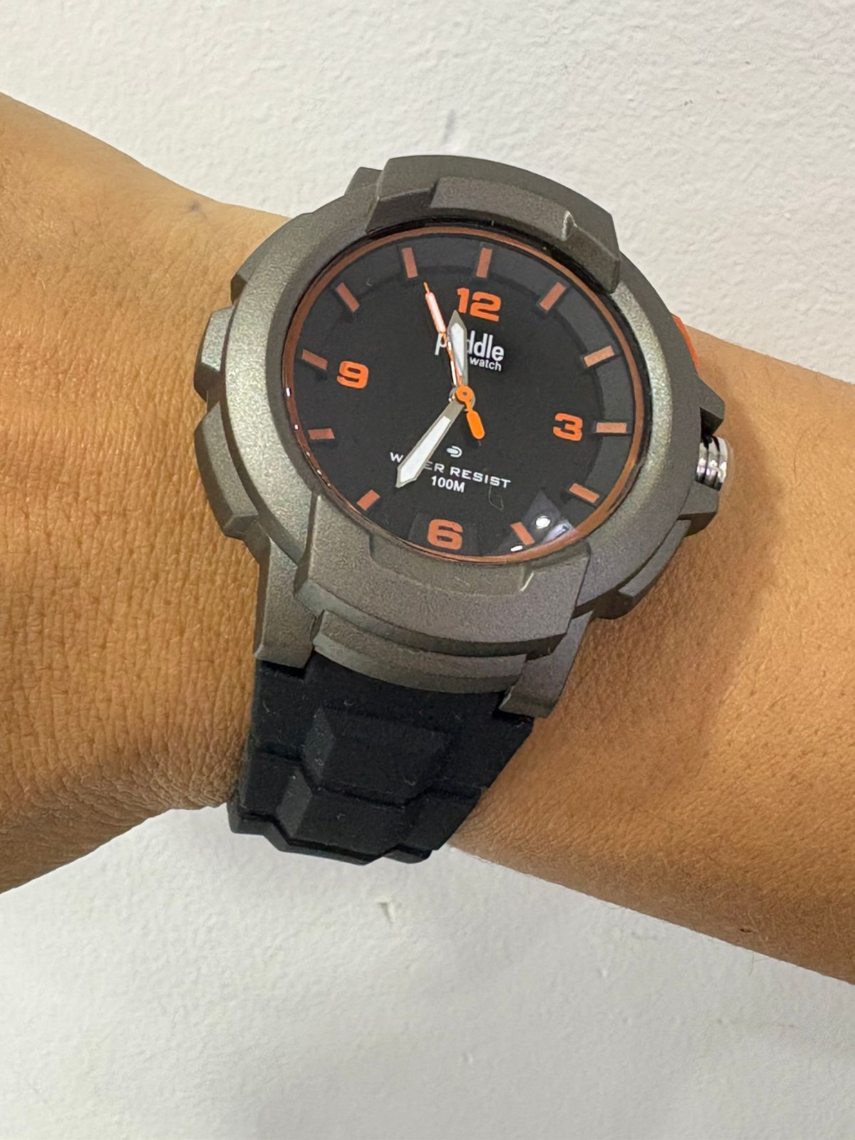 Color: Malla negra con cuadrante gris y detalles en color naranja y blanco