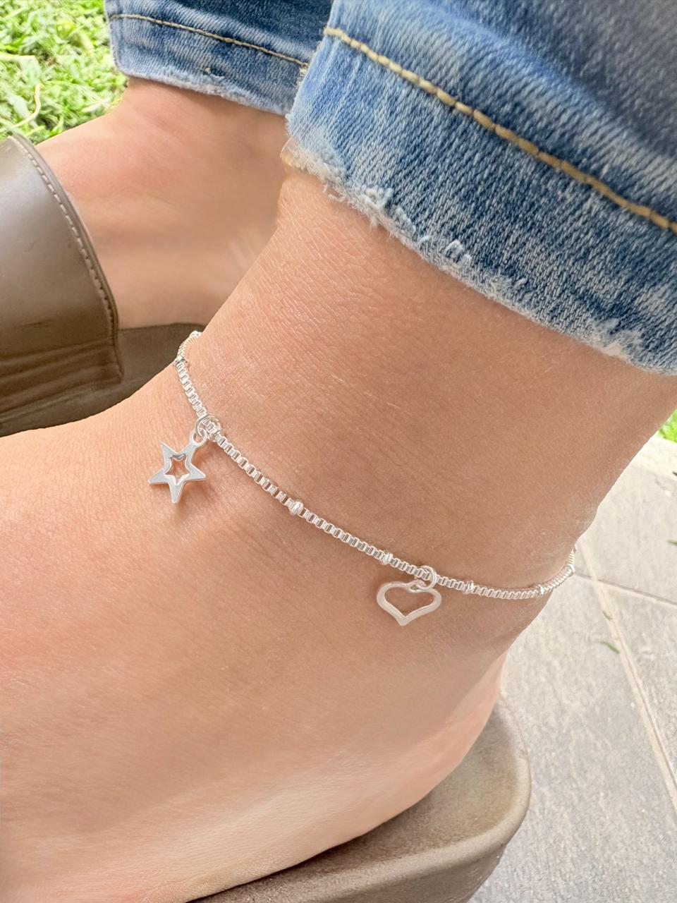 Modelo: Tobillera con dijes estrellas y corazones colgantes y movibles entre esferas.