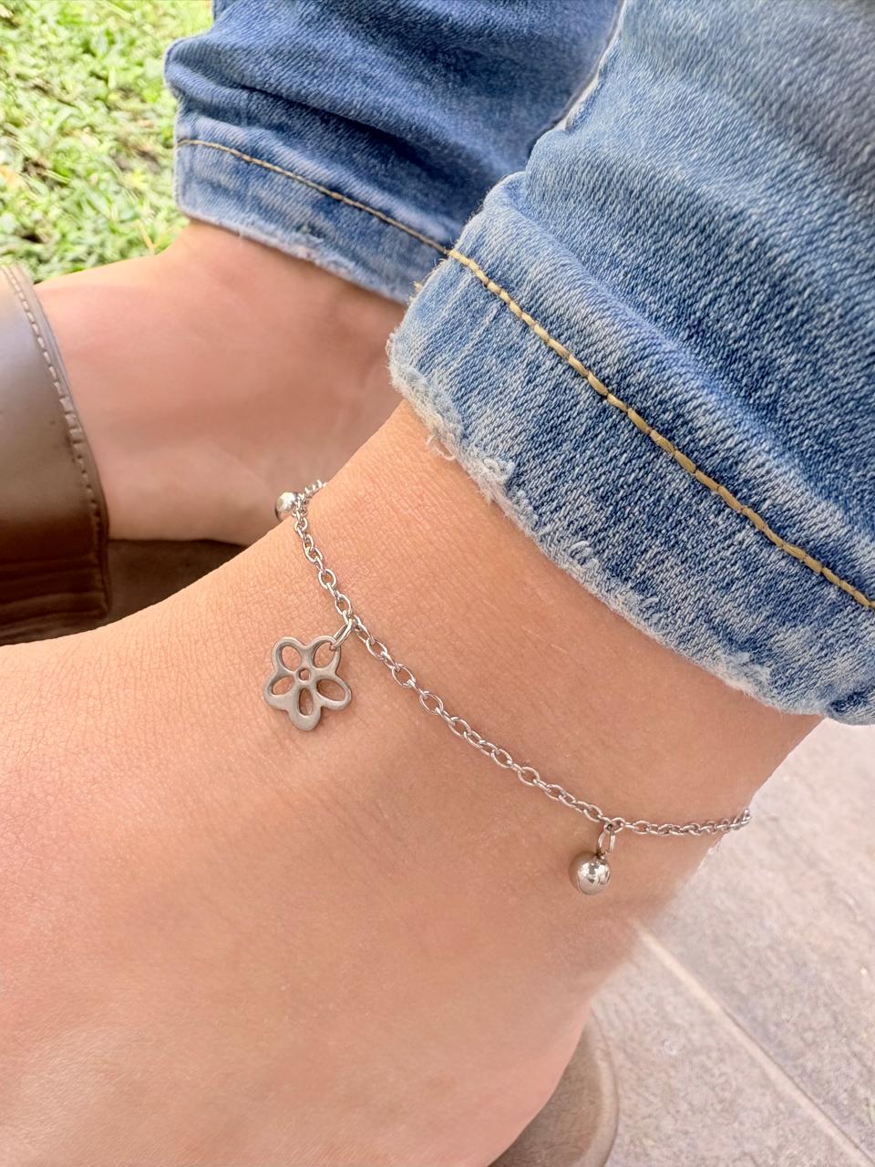 Modelo: Tobillera con dijes esferas y flores colgantes.